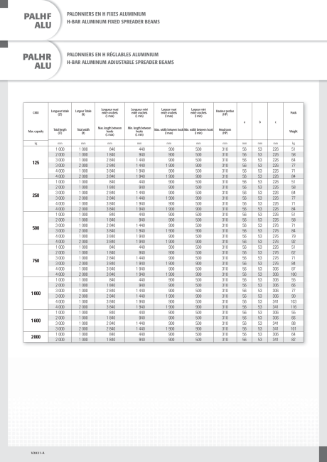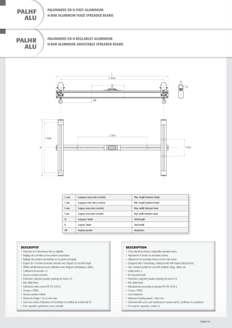Équipé de 4 crochets tournants articulés avec linguets de sécurité forgés, d'oeillets antidéchirement pour utilisation avec élingues synthétiques ou câbles. Réglage des crochets sur les poutres secondaires.