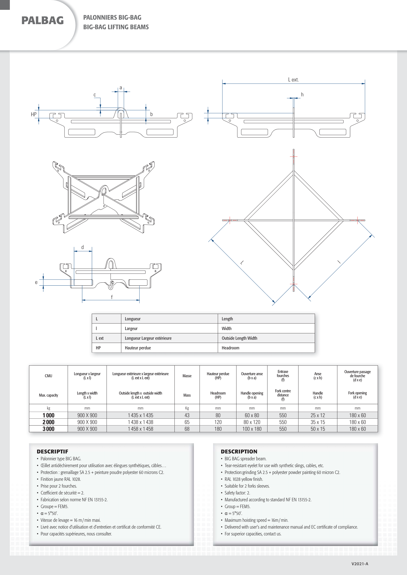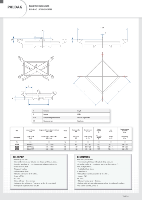 Palonnier BIG BAG, avec crochets tournants et linguets de sécurité.